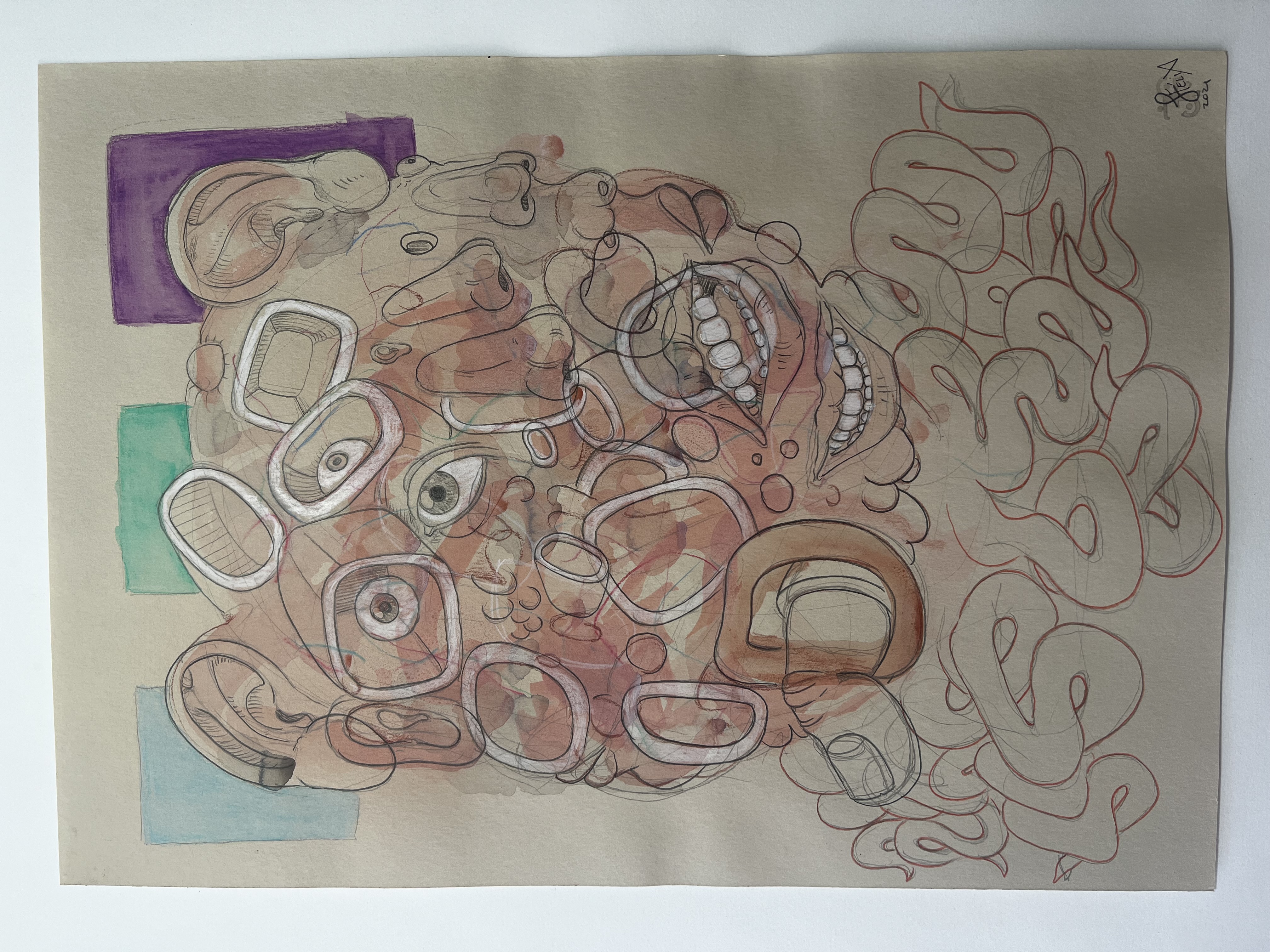 lápiz, tinta a pluma, lápices de color y acrílico sobre papel de dibujo 250gr